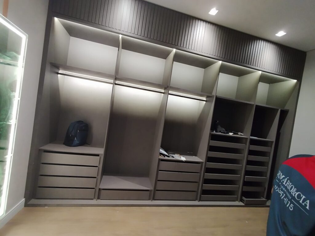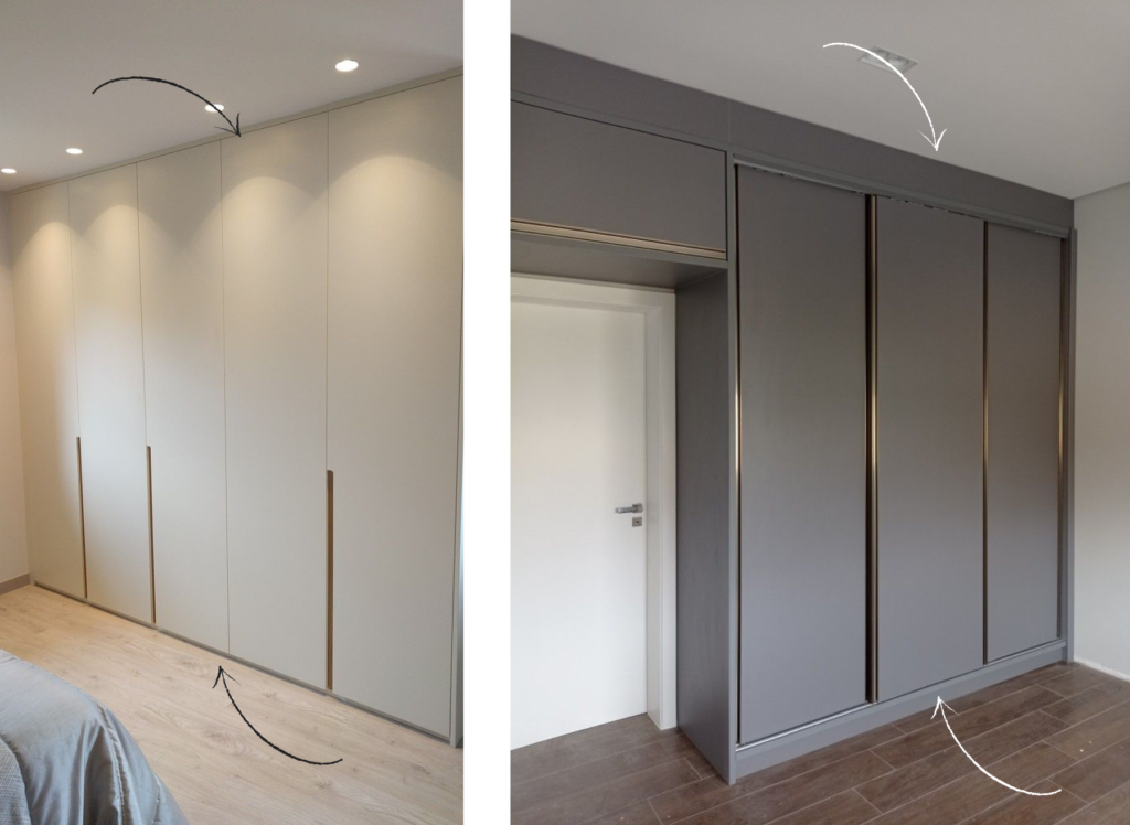 Nessas situações, a solução não é “forçar” o armário até o teto, mas tratar o fechamento superior como detalhe arquitetônico.