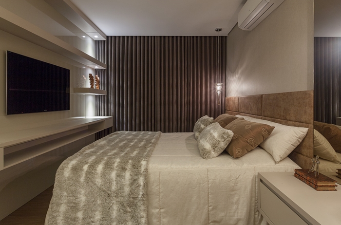 O dormitório principal foi executado em MDF Titânio Cristallo da Duratex, combinado com MDF Chamois.