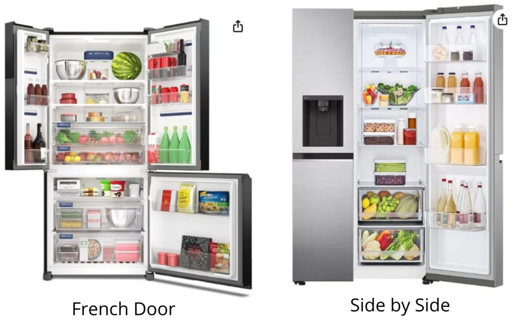 Diferença visual entre geladeira French Door e Side by Side: observe a organização interna e o tamanho do freezer.